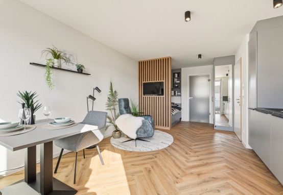 Die Apartments passen in Ausstattung, Materialwahl und Farbkonzept ideal in die moderne, kreative und florierende Stadt. Großflächige Fenster - und ein besonderes Highlight, die gemütliche Sitzbankvertiefung im Fenster, die zum Sitzen, Liegen oder Arbeiten einlädt – eine praktische Küchenzeile, ein stilvoller Wohn- und Essbereich sowie ein erstklassiges Badezimmer lassen keine Wünsche offen. Für deine persönlichen Rückzugsmomente steht dir ein eigener Balkon oder eine Terrasse zur Verfügung.